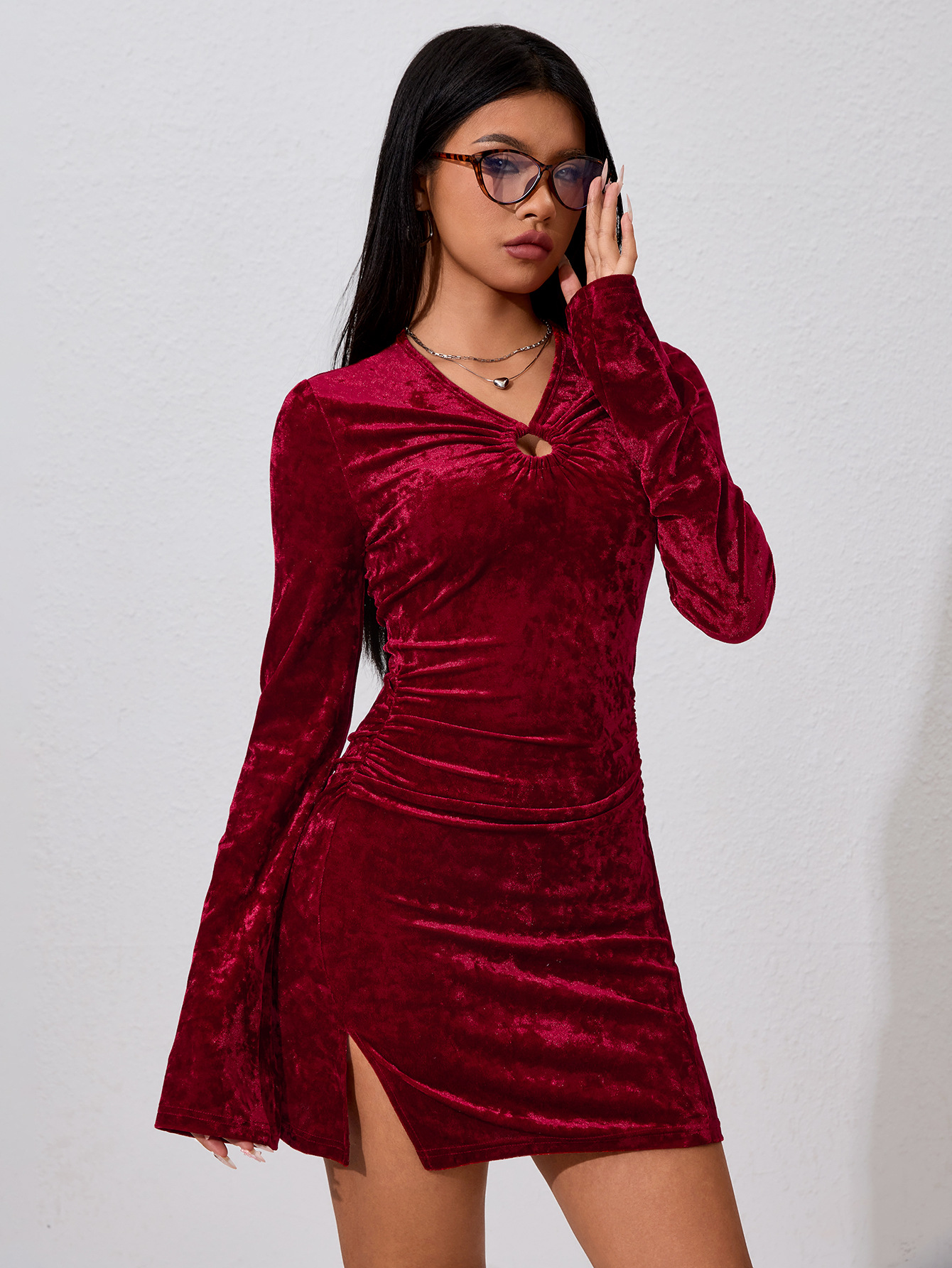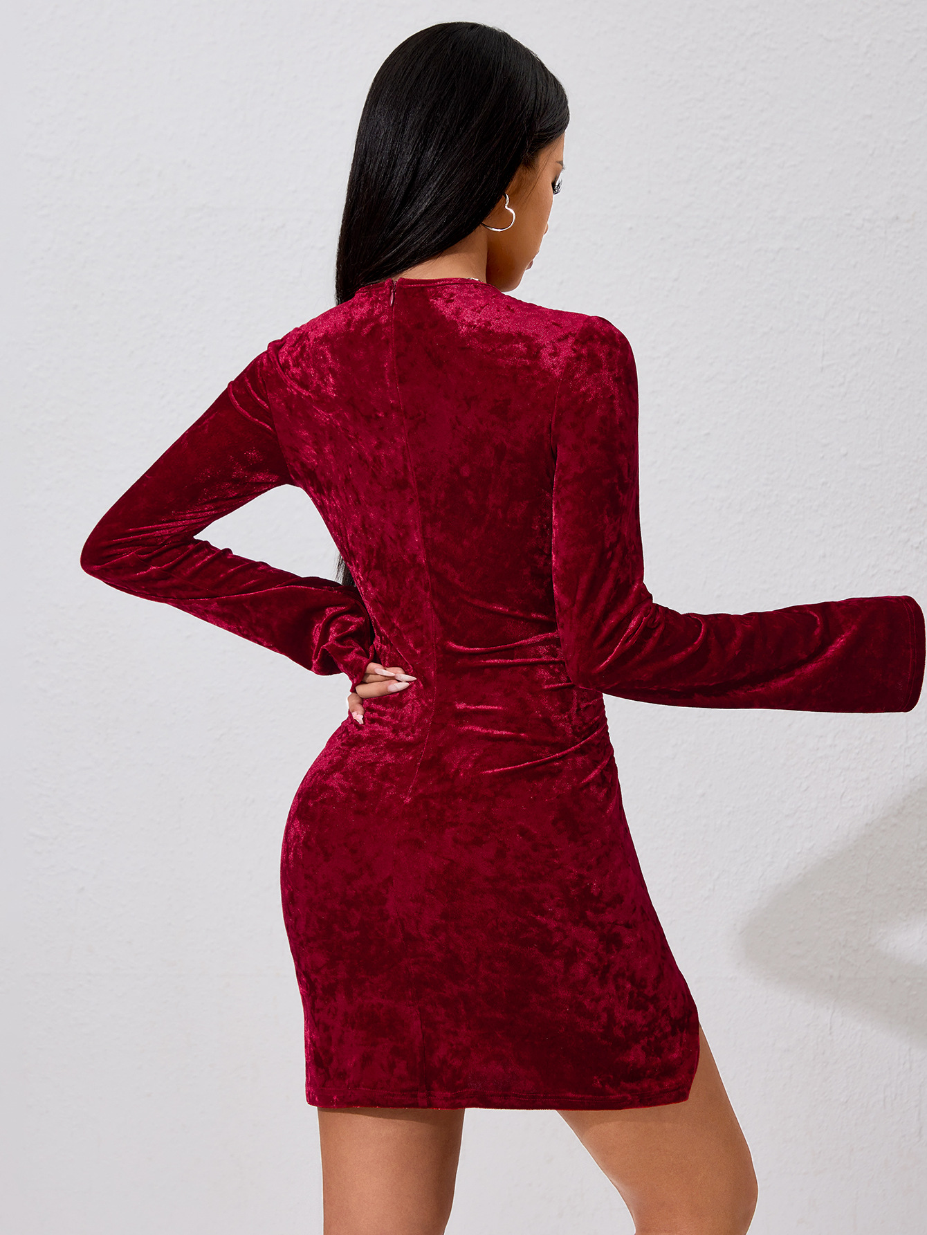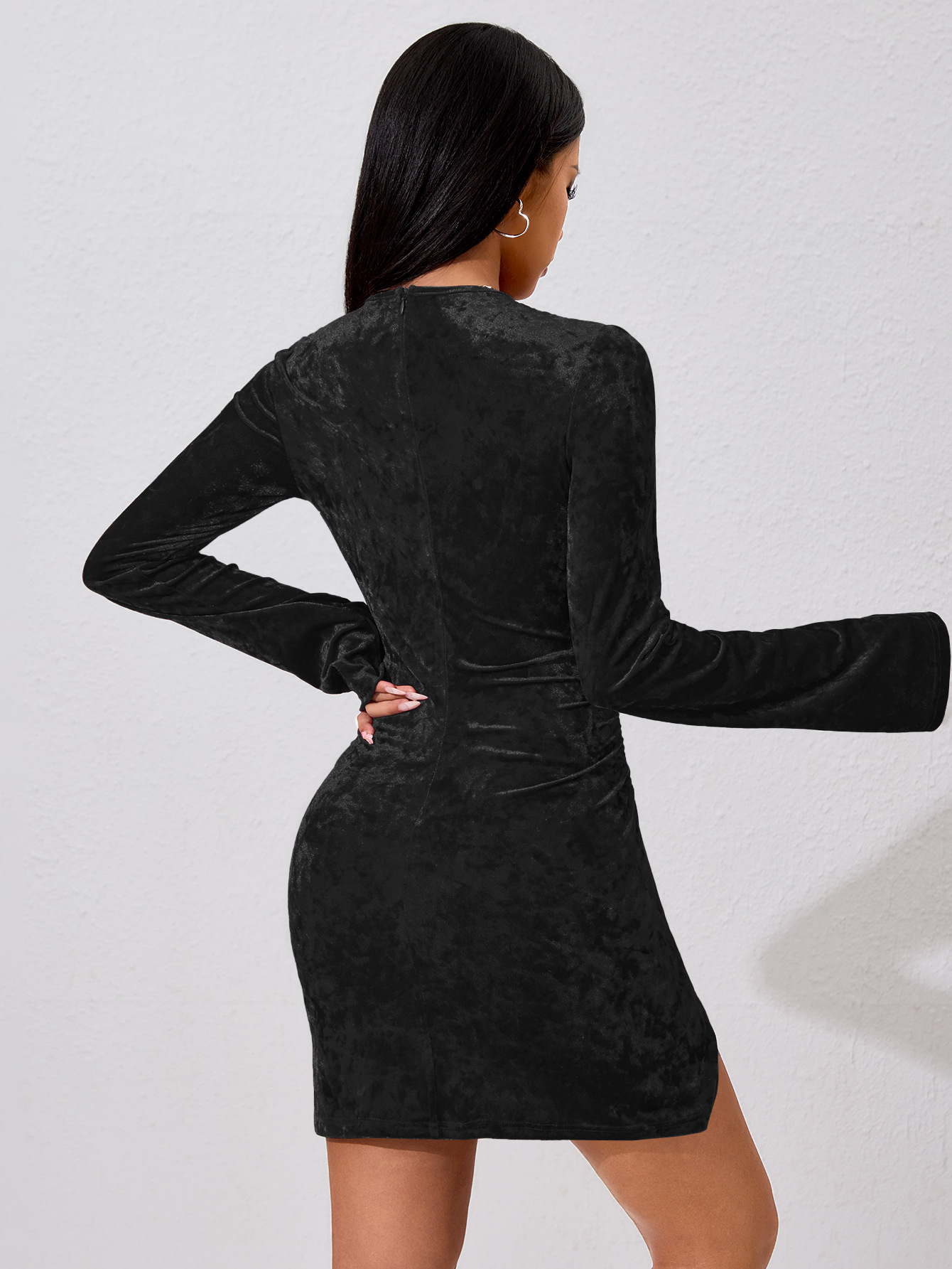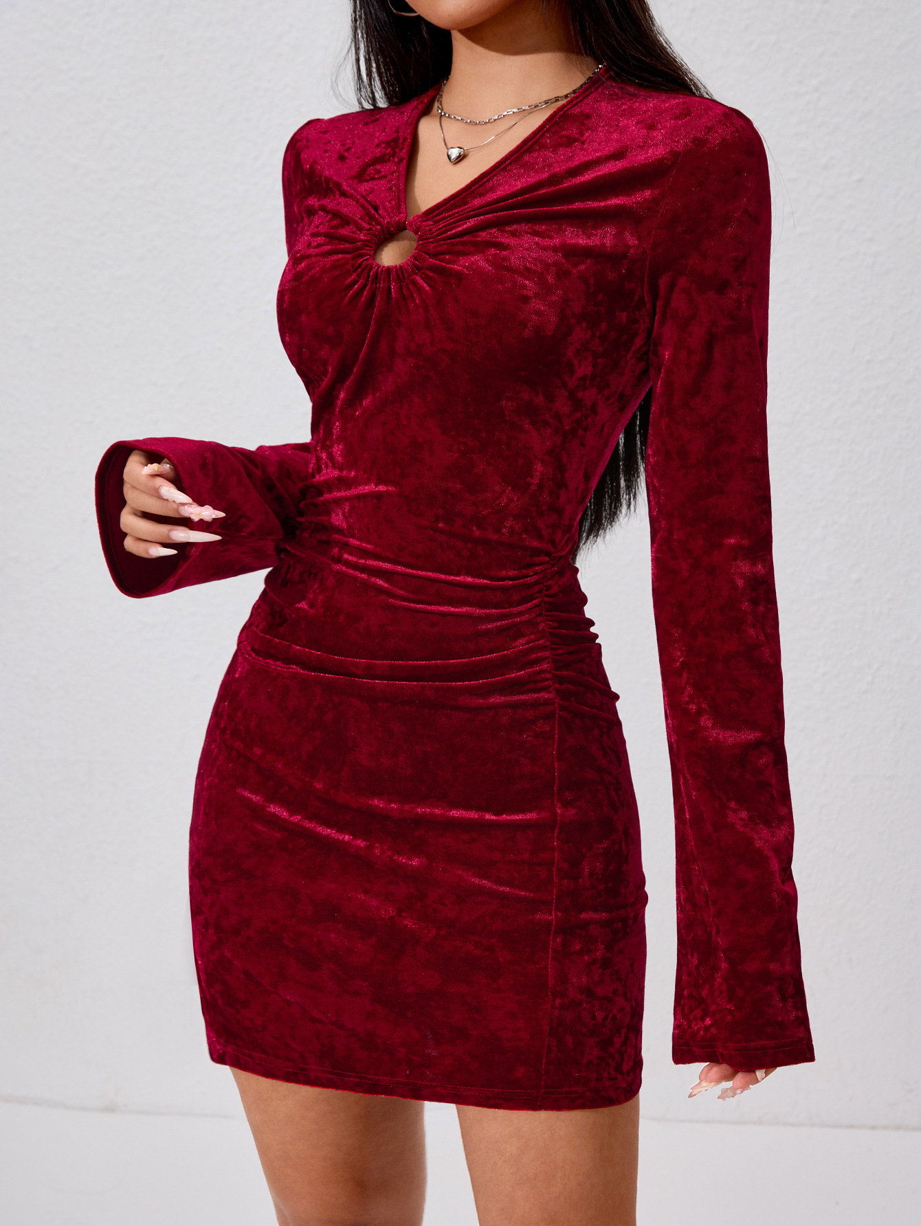 Female Solid Color Flared Sleeve Pleated Waist Bag Hip Dress