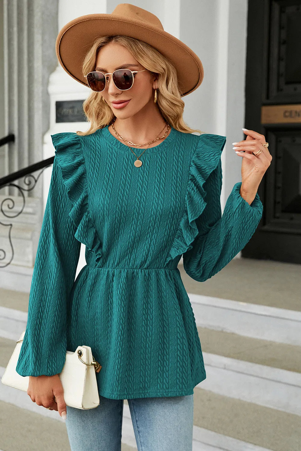 En feminin topp med volangdetaljer som ger både rörelse och charm. Tyget är helt ogenomskinligt och har en lätt stretch för bekväm passform. Perfekt att bära till både jeans och kjol för en söt men stilfull look.